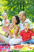 Szczęśliwa młoda para z dziećmi zabawy w parku