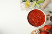 Słoik smacznej pasty pomidorowej i składników na drewnianym stole, płaski leżak