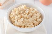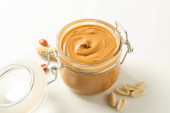 masło orzechowe w szklanym słoju na niebieskim tle