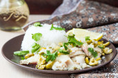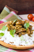 Gulasz wieprzowy, smażone wołowiny z białym ryżem, smaczne danie