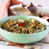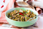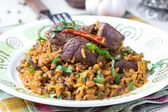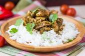 Gulasz wieprzowy, smażone wołowiny z białym ryżem, smaczne danie