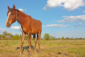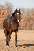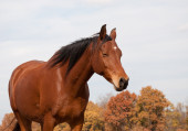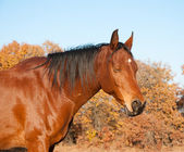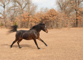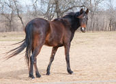 piękny czerwony zatoce koni arabskich w zimowych suche pastwiska
