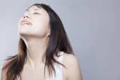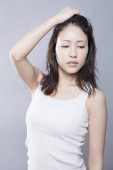 Piękna Azjatka trzymająca się za ręce. Głowa masująca