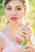 Młoda kobieta z szare oczy i długo brązowe włosy przytrzymanie różowy przepływu