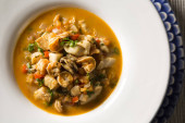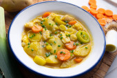 Gulasz z morszczuka z ziemniakami, porami i innymi warzywami sezonowymi.