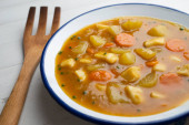 Gulasz z morszczuka z ziemniakami, porami i innymi warzywami sezonowymi.