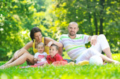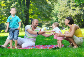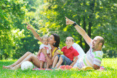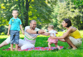 Szczęśliwa młoda para z dziećmi zabawy w parku