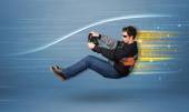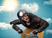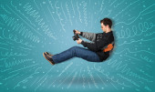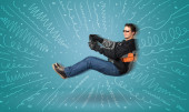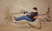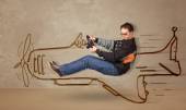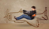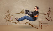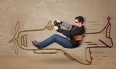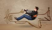 Zabawny pilot prowadzący ręcznie rysowany samolot na ścianie