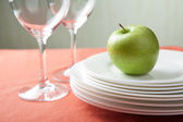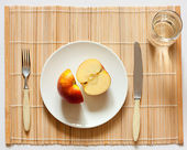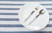 Biała płyta ze stali nierdzewnej łyżka i widelec zestaw umieszczony obok