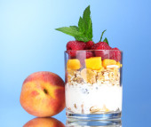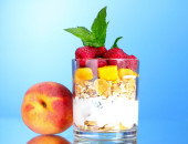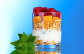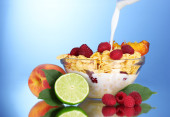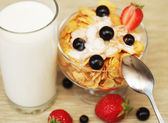 smaczne płatki śniadaniowe, owoce w szklanej misce i mleka