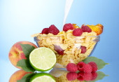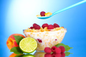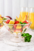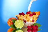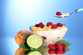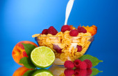 smaczne płatki kukurydziane, owoców i mleka w szklanej misce