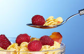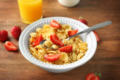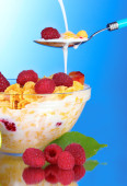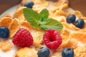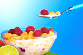 smaczne płatki kukurydziane, owoców i mleka w szklanej misce