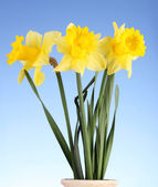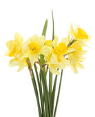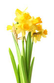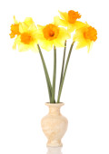 żółte żonkile w wazonie na białym tle