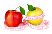 ręcznik, jabłko z środka taśmy, hantle i butelka wody isola