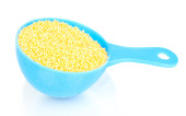 Grys kukurydziany w zielony łyżka z tworzywa sztucznego na białym tle