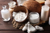 Świeży olej kokosowy w szkło i drewnianą łyżką na kolor drewniany stół tło