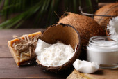 Zdjęcie "Świeży olej kokosowy w szkło i drewnianą łyżką na kolor drewniany stół tło" może być wykorzystywane do celów osobistych i komercyjnych zgodnie z warunkami zakupionej licencji Royalty-free. Obraz jest dostępny do pobrania w jakości wysokiej rozdzielczości do 5760x3840.
