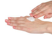 piękna kobieta ręce z Francuski manicure na drewnianym stole