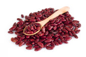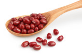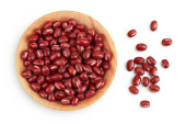Czerwona fasola Adzuki w drewnianej misce na białym tle.