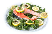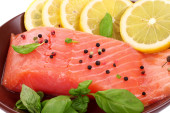 czerwona ryba na talerzu z pieprzem i zielonych liści