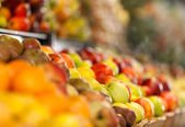 zdjęcie kolorowego stoiska owocowego z brzoskwiniami, śliwkami i melonami w sklepie spożywczym, nikt, zdjęcie obiektu
