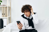 szczęśliwy i kręcone transgender social media influencer machanie ręką podczas strumieniowania online w sypialni
