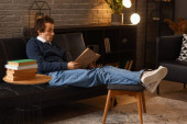 szczęśliwy transgender influencer w różowy sweter pisanie w notatniku i siedzi na kanapie, baner