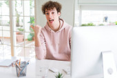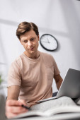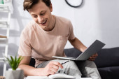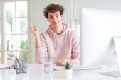 szczęśliwy androgynous freelancer w różowy sweter i okulary gospodarstwa smartfon w pobliżu laptopa na biurku