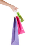 ręka trzyma kolorowe torby na zakupy na białym tle