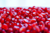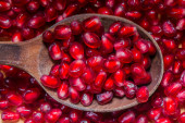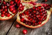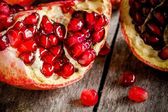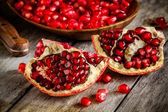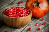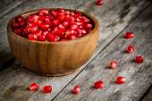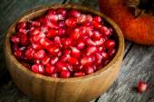 zbliżenie ziarna granatu Ruby drewniane miski na stole