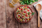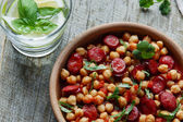 Smażony filet kurczaka papryka pomidory zielony groszek w plasterkach