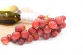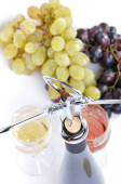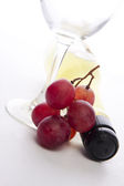 butelka wina z aperitive, okulary i winogron na białym tle w kolorze białym
