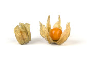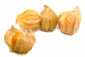 Pęcherzyca owoce i plastikowy kosz i na białym tle