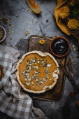 Zdjęcie "tło dziękczynienia, dekorowane ciasto dyniowe w pobliżu sztućców, herbata i przyprawy z ziołami na kamiennym stole" może być wykorzystywane do celów osobistych i komercyjnych zgodnie z warunkami zakupionej licencji Royalty-free. Obraz jest dostępny do pobrania w jakości wysokiej rozdzielczości do 5760x3840.