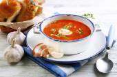 Ukraiński buraki zupa - barszcz, w serwetkę, na tle drewniane
