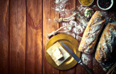 Widok z góry wino i chleb na lepszy drewniany stół