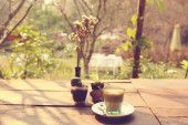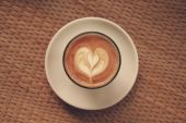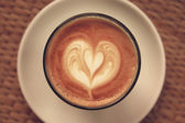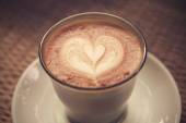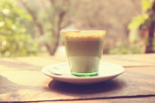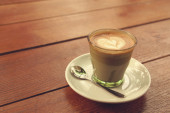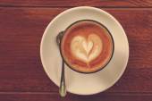 Kawa latte art na tle struktura drewna - efekt Vintage