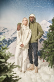 atrakcyjne zróżnicowane pary pozowanie razem w różowe kominiarki z tłem górskim, koncepcja zima