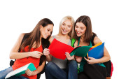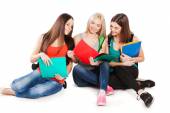 Zdjęcie "Trzech studentów zadowolony siedzi z zabawy, uśmiechając się i patrząc na kamery na białym tle." może być wykorzystywane do celów osobistych i komercyjnych zgodnie z warunkami zakupionej licencji Royalty-free. Obraz jest dostępny do pobrania w jakości wysokiej rozdzielczości do 5760x3840.