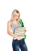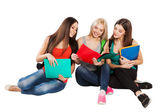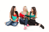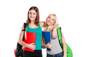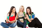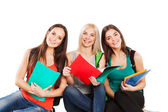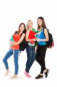 trzech studentów szczęśliwy stały wraz z zabawy, uśmiechając się i patrząc na kamery na białym tle.
