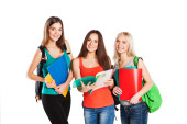 Zdjęcie "trzech studentów szczęśliwy stały wraz z zabawy, uśmiechając się i patrząc na kamery na białym tle." może być wykorzystywane do celów osobistych i komercyjnych zgodnie z warunkami zakupionej licencji Royalty-free. Obraz jest dostępny do pobrania w jakości wysokiej rozdzielczości do 5760x3840.