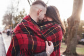 Zdjęcie "Piękna para zakochana w kratkę czerwone koszule, dzianiny czapki przytulić mocno nos w twarz wśród zielonego rynku choinki. Młody mężczyzna się śmieje, całuje cudowną kobietę. Wakacyjna atmosfera" może być wykorzystywane do celów osobistych i komercyjnych zgodnie z warunkami zakupionej licencji Royalty-free. Obraz jest dostępny do pobrania w jakości wysokiej rozdzielczości do 5760x3840.