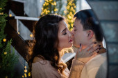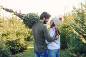 Piękna para zakochana w kratkę czerwone koszule, dzianiny czapki przytulić mocno nos w twarz wśród zielonego rynku choinki. Młody mężczyzna się śmieje, całuje cudowną kobietę. Wakacyjna atmosfera