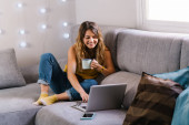 Strzał ładnej młodej kobiety pracującej z laptopem, pijącej filiżankę kawy na kanapie w domu. Patrzę w kamerę.