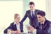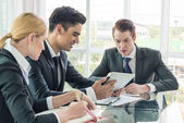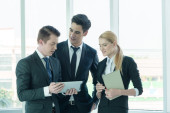 partnerzy biznesowi omawiający dokumenty i pomysły na spotkaniu