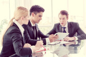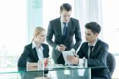 partnerzy biznesowi omawiający dokumenty i pomysły na spotkaniu