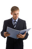 Wyświetlono dokumentu lub umowy, na biały biznesmen