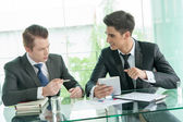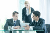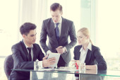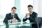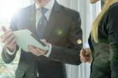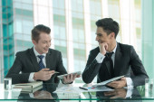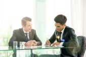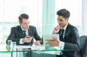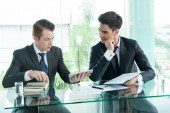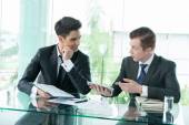 partnerzy biznesowi omawiający dokumenty i pomysły na spotkaniu