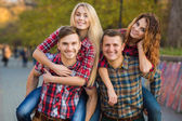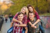 Czterech dobrych znajomych rozluźniać i mieć zabawa w parku jesień.