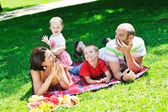 Szczęśliwa młoda para z dziećmi zabawy w parku